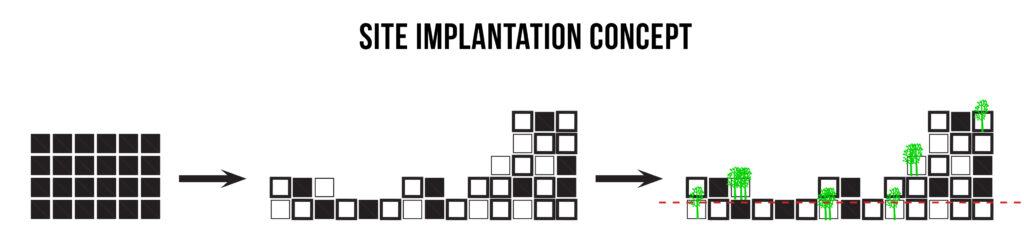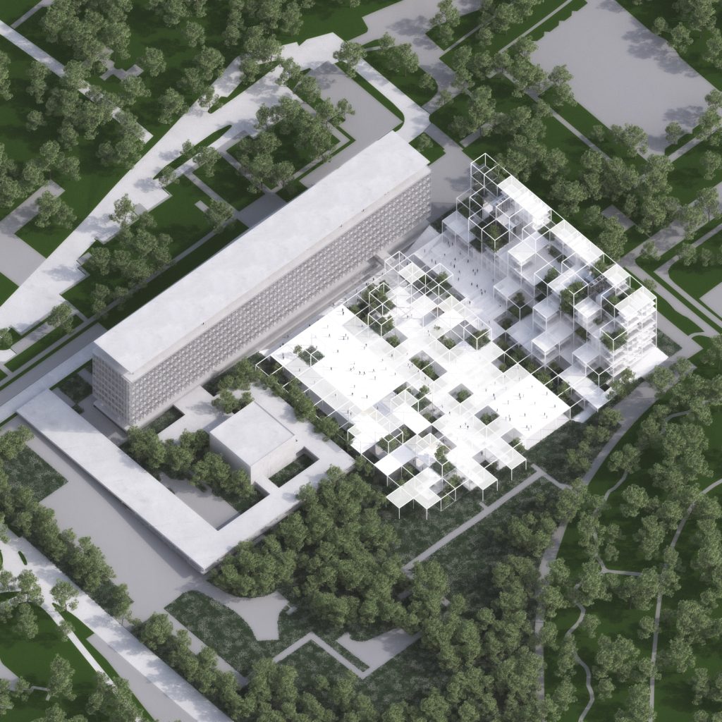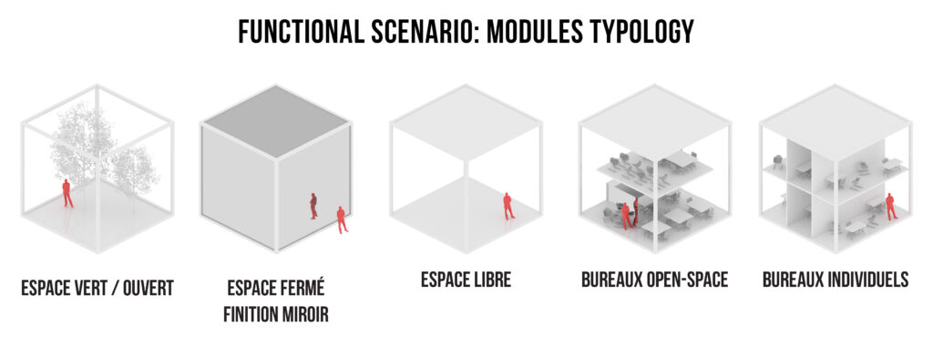 We proposed a space composed of cube modules with different options for the division of space, both horizontally and vertically. We obtain a light modular structure and a maximum of flexibility and diversity of spaces typologies that can change in time according to the organization’s needs. The modular structure also enables all types of permutations until the best configuration is found.