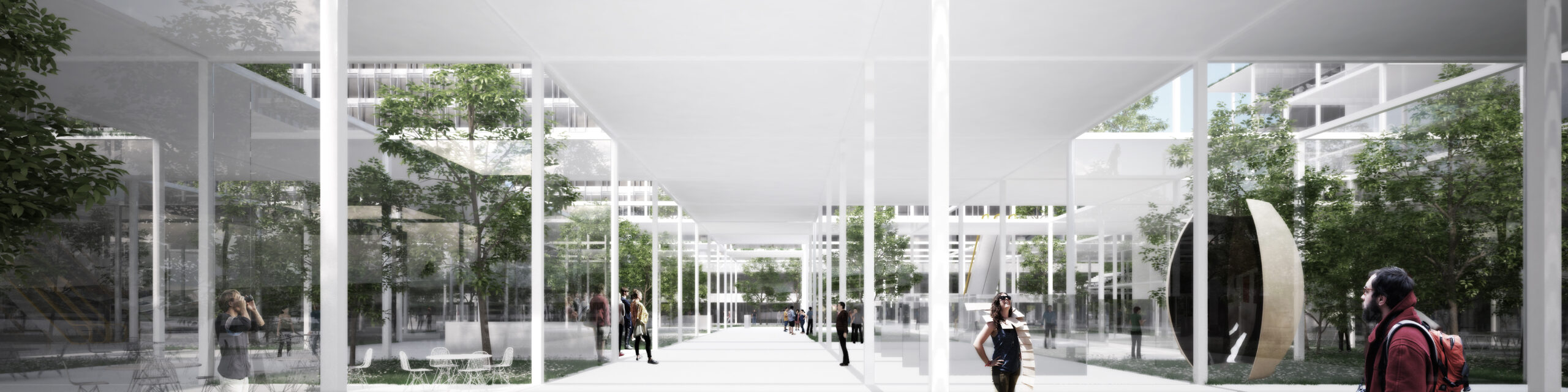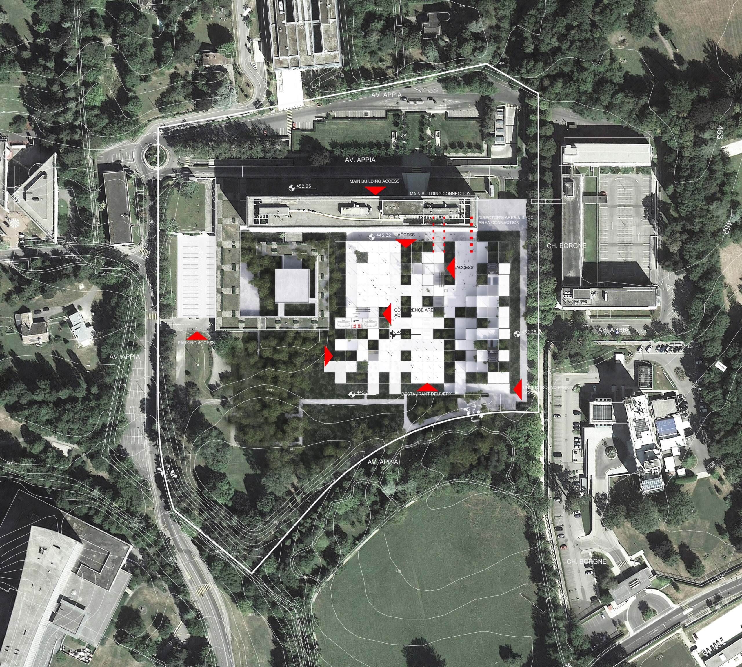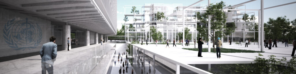 The World Health Organization Headquarters Extension will develop around the level zero of the existing Jean Tschumi building. It is a game between the ground level and the public space that blends with the landscape to form a complex whole. The project concentrates its public program below the level 0 of the existing J. Tchumi building in a lightweight structure that has the ability to blend into the landscape: the main view is slightly affected and the implementation respects the pedestrian permeability required.