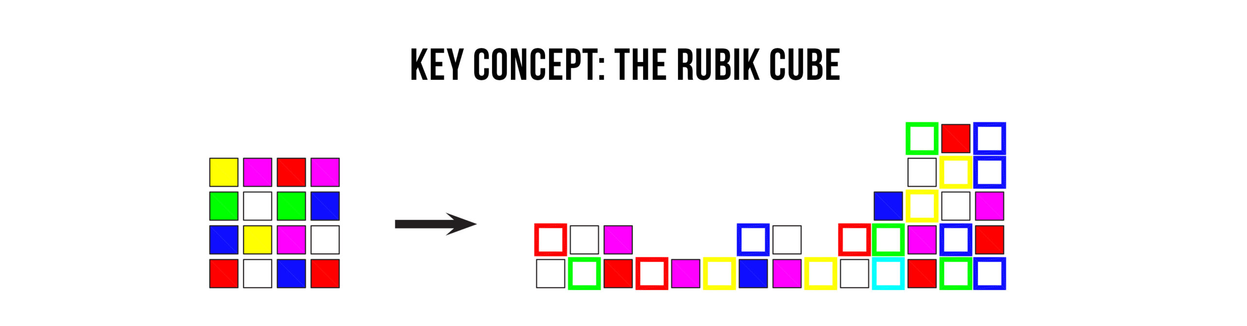 In the final state, each face of the Rubik’s cube is a uniform different color than the others, but the independent rotation of each face generates a mix of small different color cubes . The number of different positions exceeds 43 trillion.