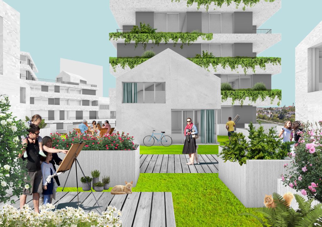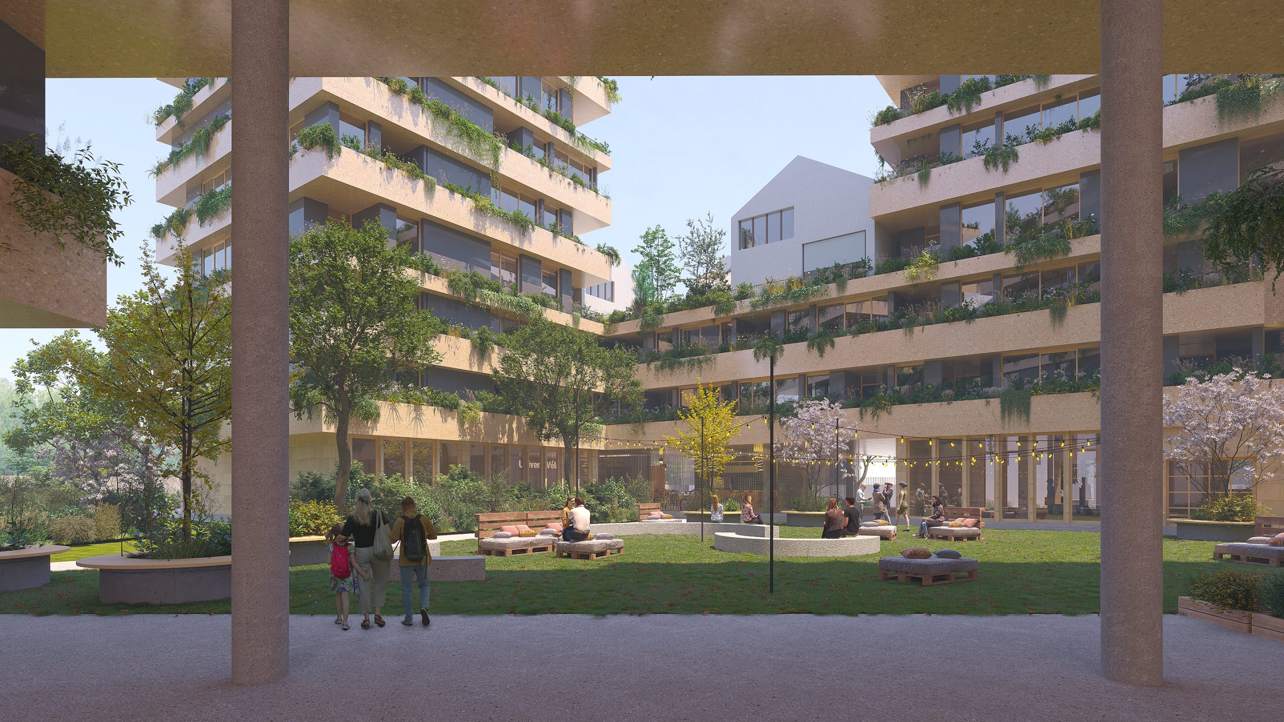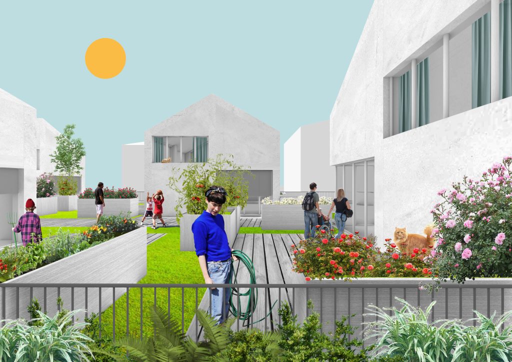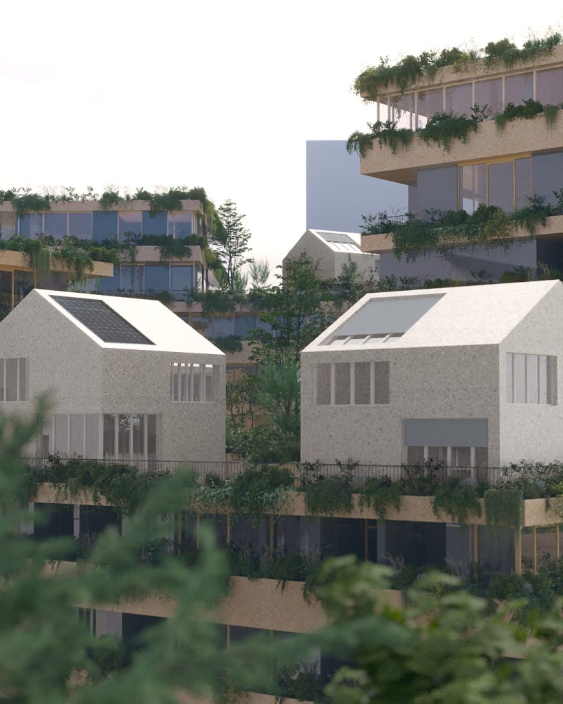 A raised landscape at R+2 introduces a second ground plane—shared terraces, private gardens, productive landscapes—while the heart of the block operates as an urban micro-ecosystem: rain gardens, biodiversity refuge, and climate buffer.
