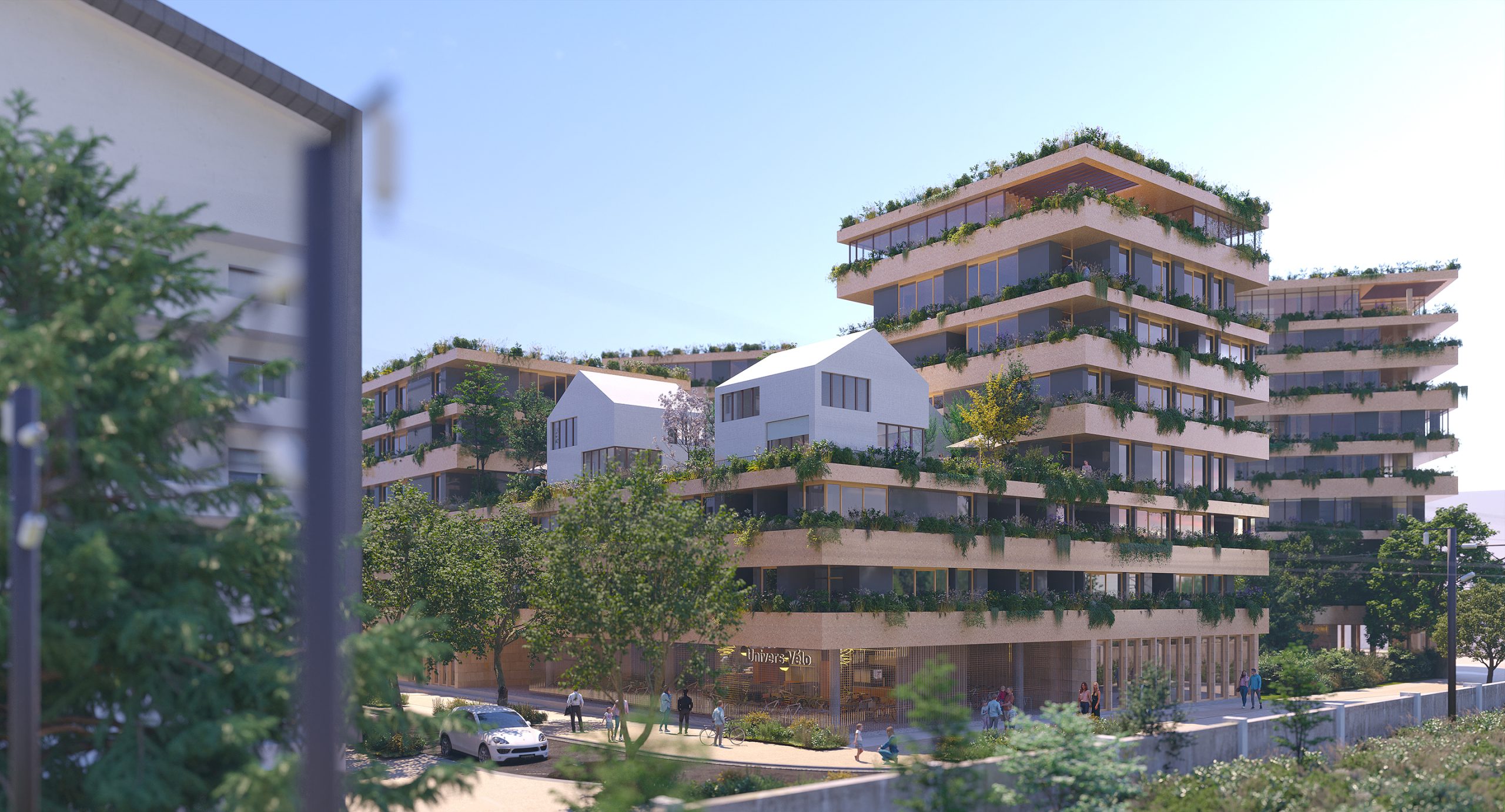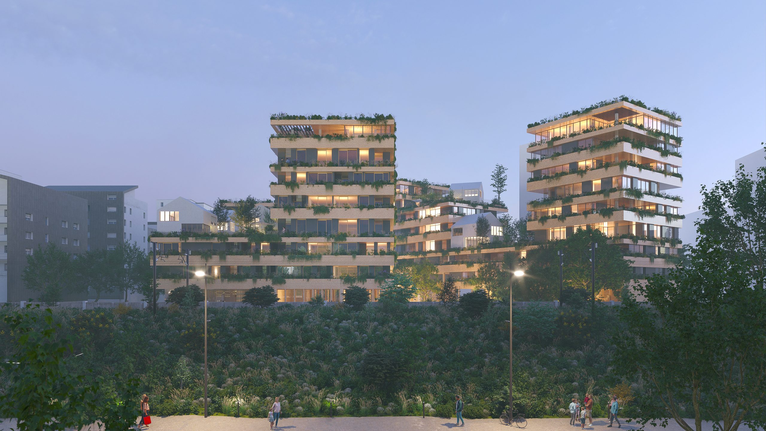A diversity of living ways that helps to lighten the image and mass of the project while integrating the densification desired by the City, notably the floating village of townhouses and its elevated green gardens.