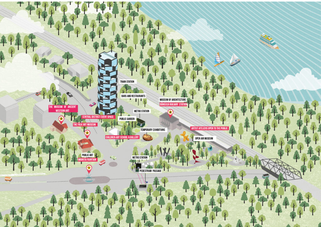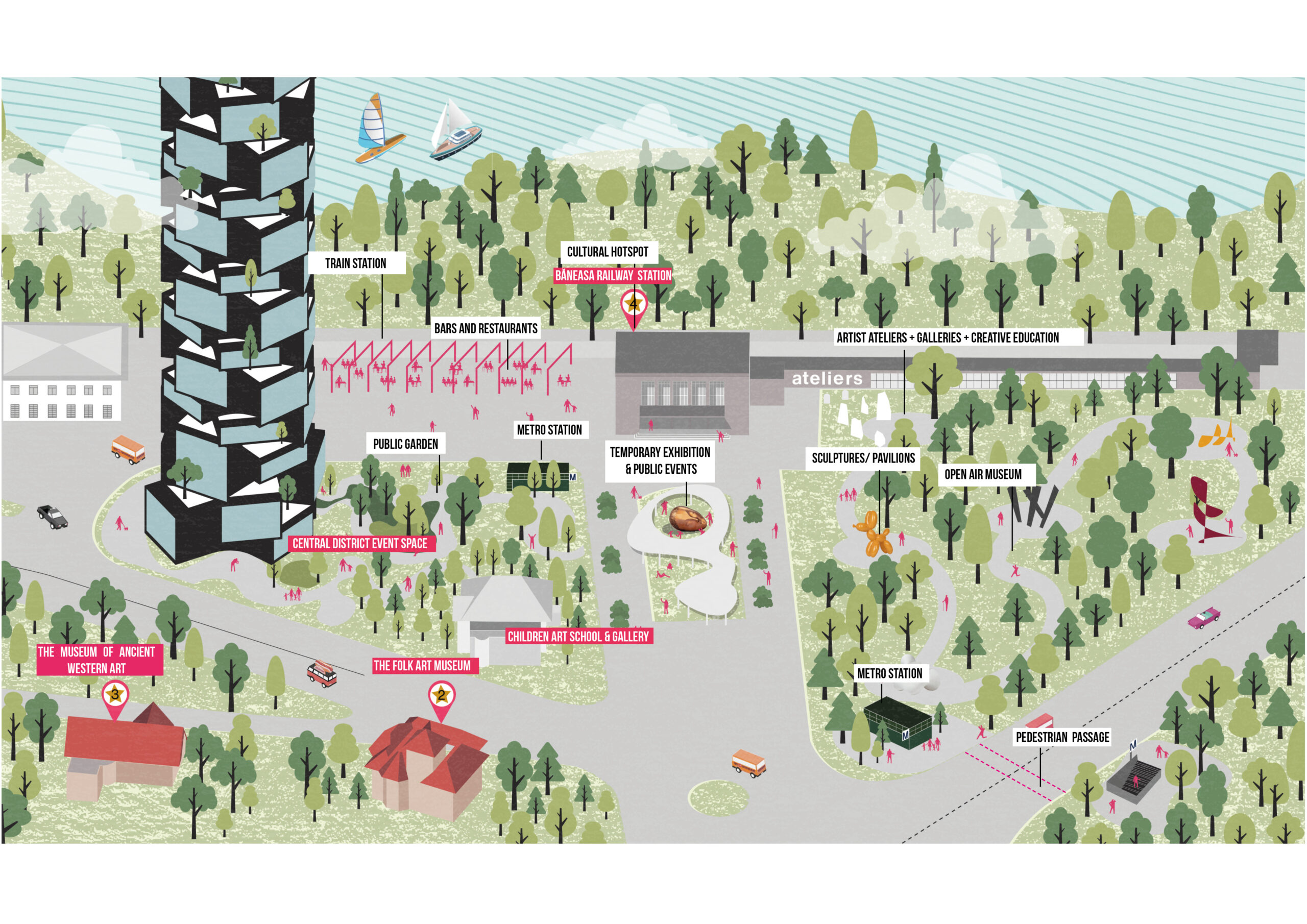 The commitment to invest in the neighbourhood will lead to the development of the entire area towards a new artistic hub for Bucharest: a new museum for architecture, an open air sculpture museum, artist ateliers, pop up pavilions, a new space for children art school and an art gallery will join the two museums already present in the area.