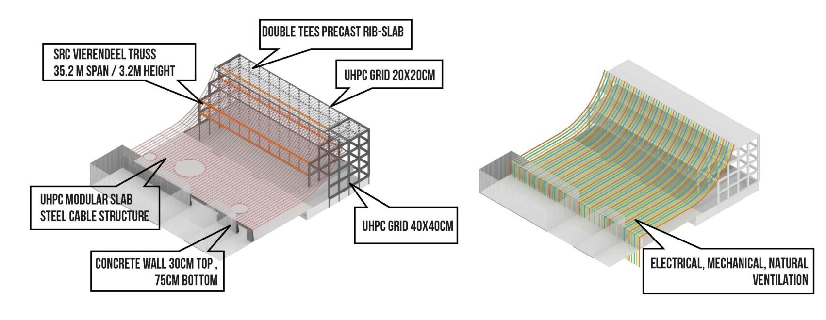 Besides structure, the curved slab will integrate all the systems of the building: Mechanical, Electrical, data networks, natural ventilation shafts, acoustic layer and lightening. All the building systems will be centralized in the underground under the sports hall locker-rooms and distributed through this curved Slab while being optimized by the BMS to produce the ideal environment.
