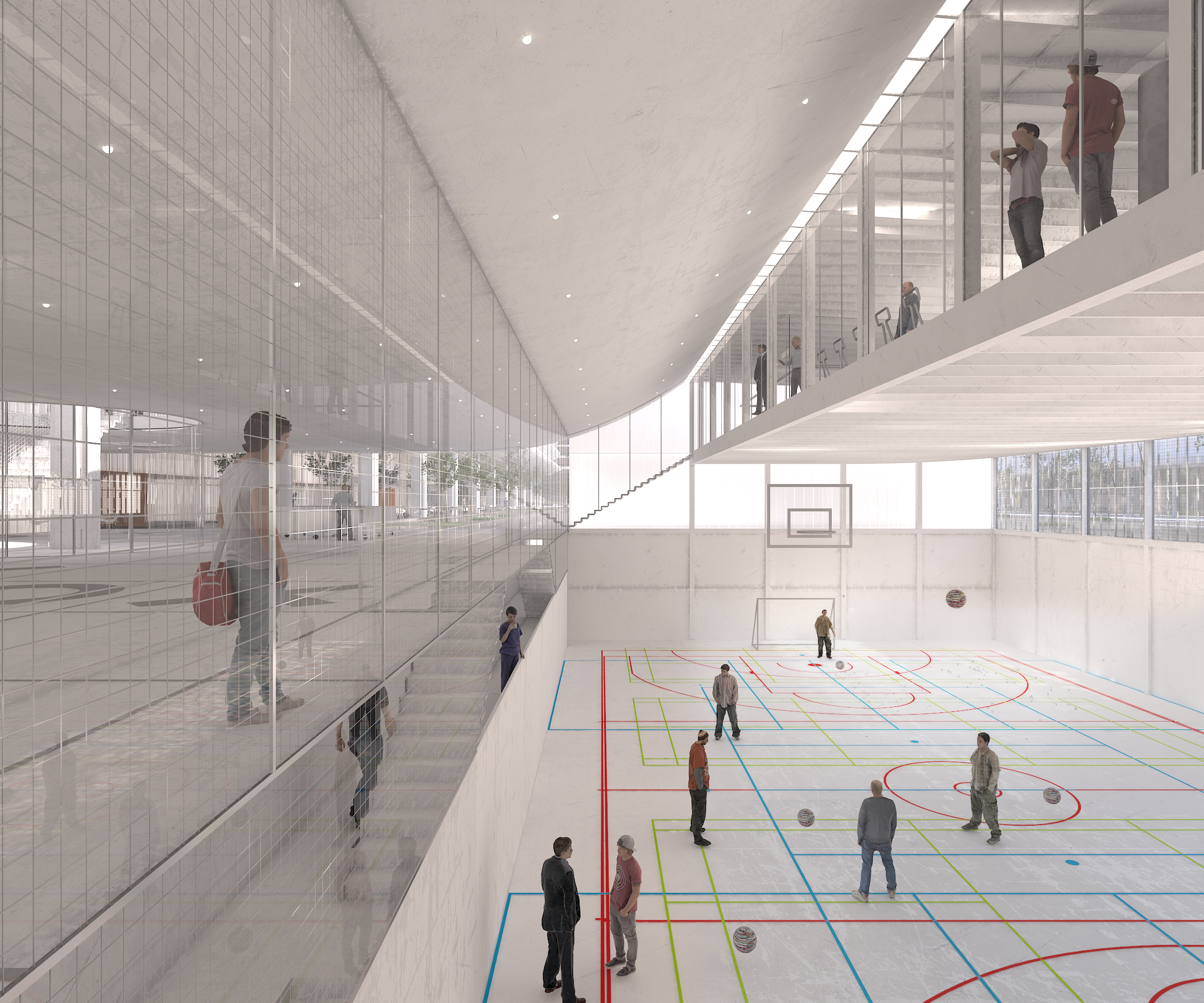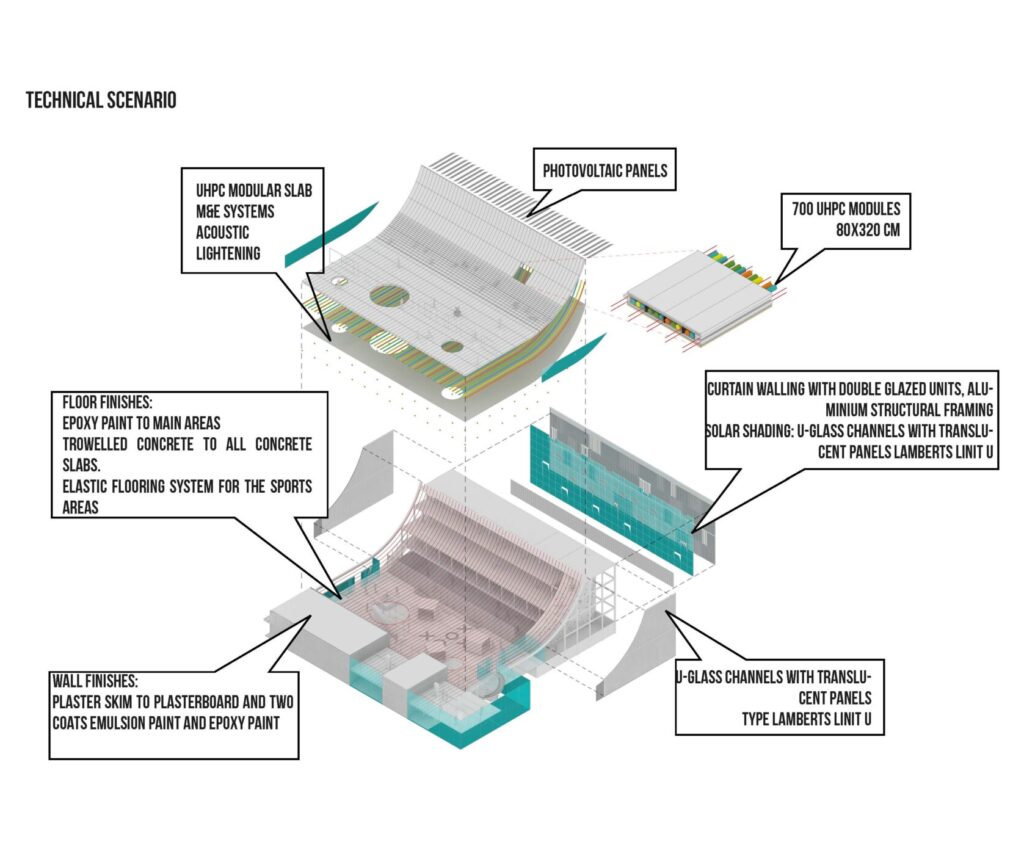 We proposed a structural volume capable of supporting the stresses coming from the curving terrace / roof while floating over the sports hall in the ground floor