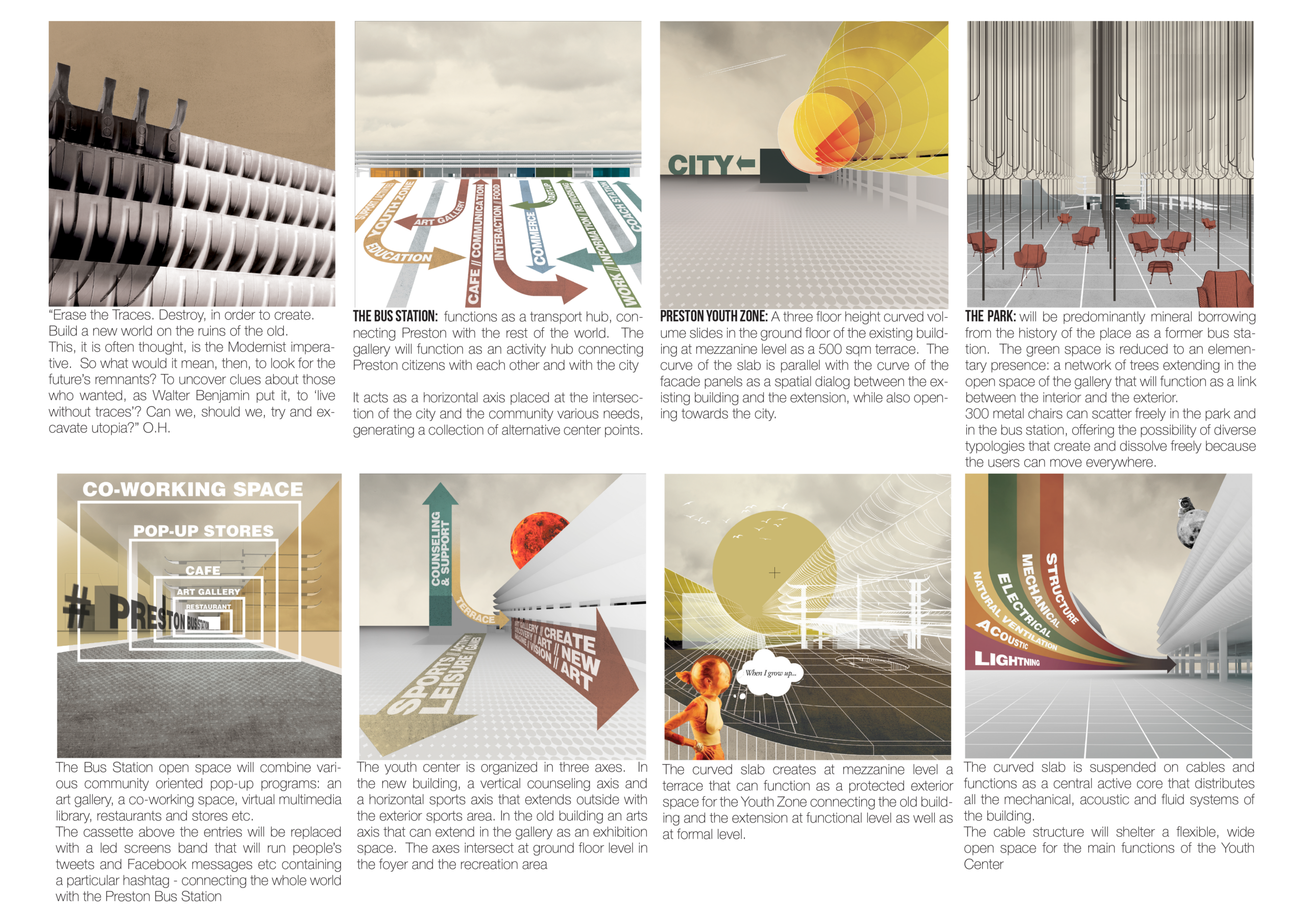 Our strategy for the Preston Bus Station aims to create an entity that can function for the community in the same way the Youth Centre functions for the children: offering a range of cultural and commercial activities that offer the possibility of connecting inside the community or the to achieve some kind of professional potential (art gallery, co-working space). In this way the space reinvents the initial function of connectivity between different cities at a local level, connecting the people in different activities and projects.