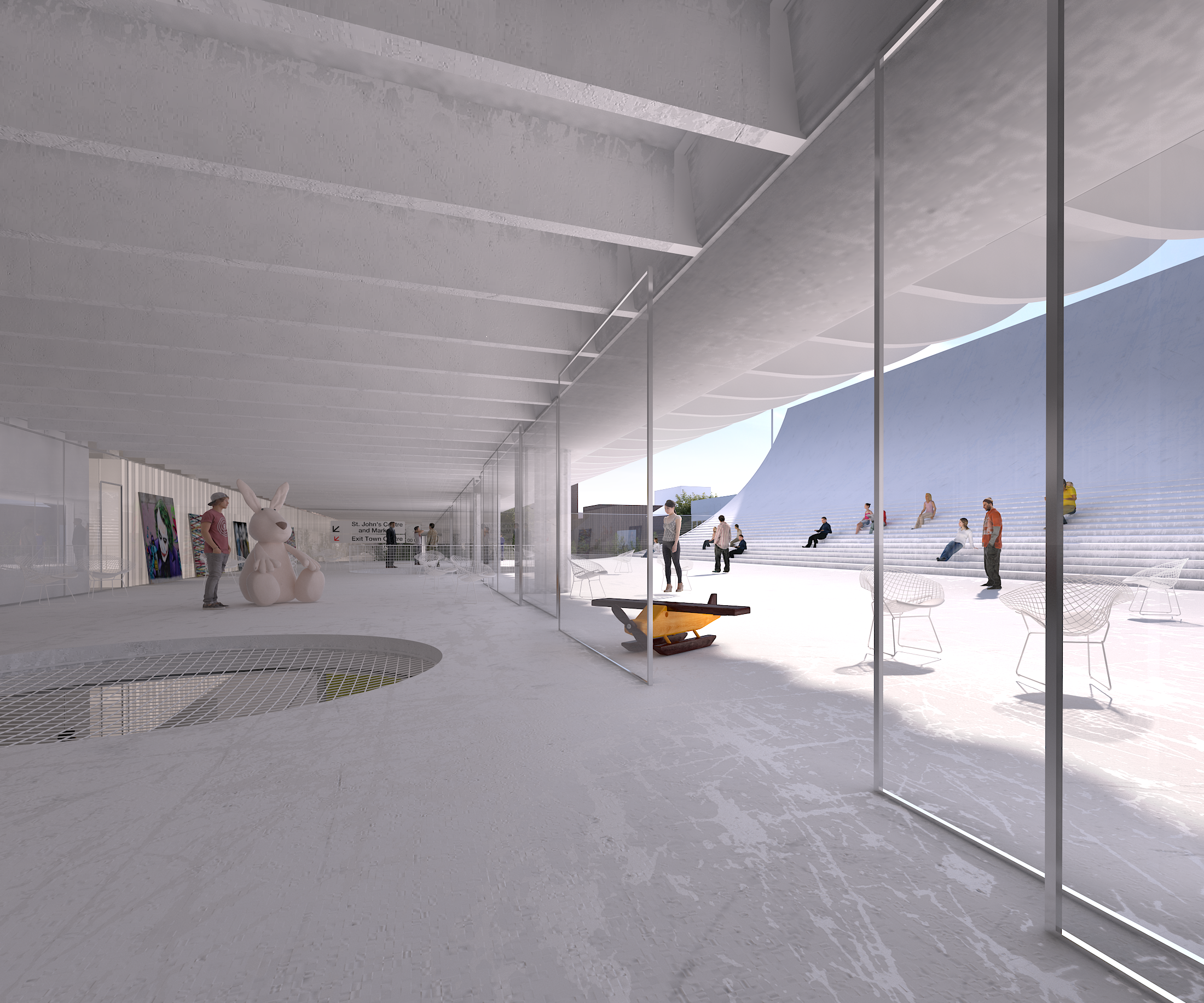 We proposed a 2000 m2 curved slab, parallel with the curve of the bus station façade that slides into the existing building at mezzanine level and creates a 500 m2 protected terrace. Three meters height transparent glass parapets will ensure the children’s protection.